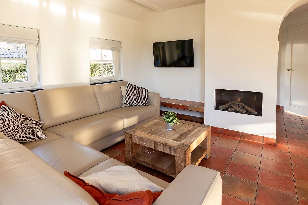 Through the entrance, you enter the spacious and atmospheric living room, furnished with a comfortable seating area and a gas-fired fireplace. Underfloor heating and French doors opening onto the terrace ensure a pleasant ambiance all year round. Outside, you will find a generous green plot with plenty of privacy and a luxury garden set with parasol on the partially covered terrace, an ideal place to enjoy outdoor living in complete tranquility.