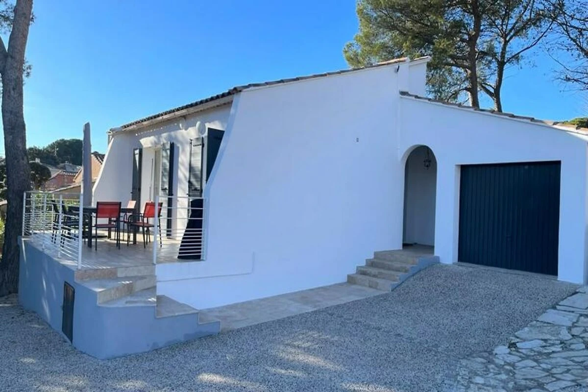 Step inside to discover a thoughtfully designed space that combines comfort and practicality. The villa accommodates up to six guests across three cozy bedrooms, including a queen-size bed and two double beds, each with ample wardrobe space. The fully equipped kitchen opens onto a spacious terrace, perfect for al fresco dining under the Provençal sun. The living and dining areas, complete with air conditioning, provide a cool retreat after a day of exploration. A modern bathroom, separate toilet, and welcoming hallway ensure convenience for all guests.